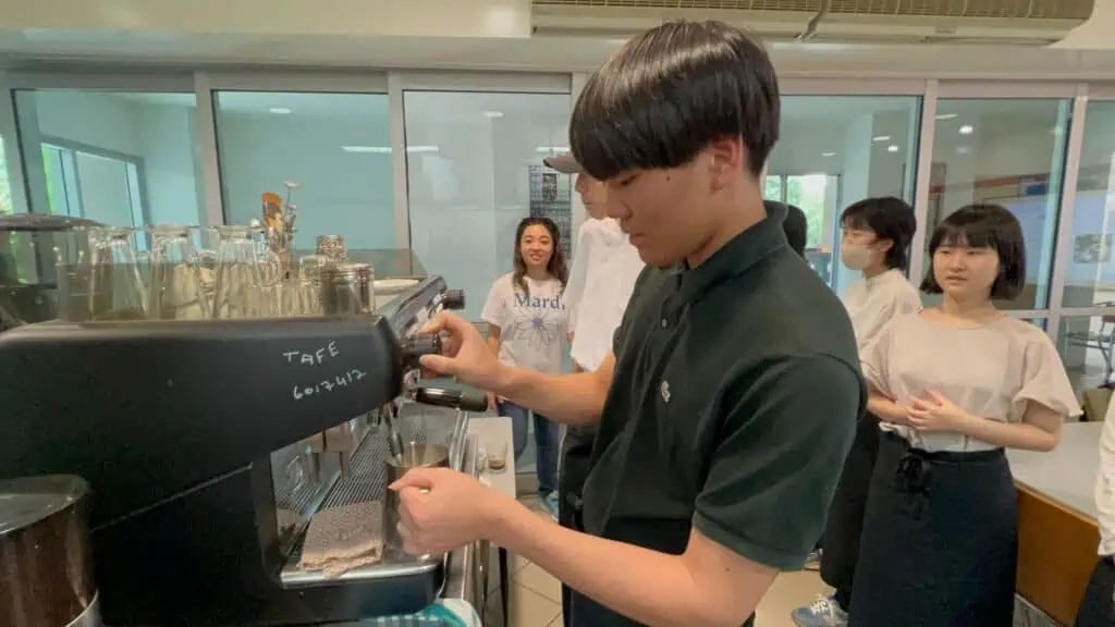 バリスタでは、コーヒー豆の種類やその違い、味や香りの特徴を学んだ後に本格的な機械でコーヒーをいれます。自分でいれたコーヒーは本当に美味しいです!