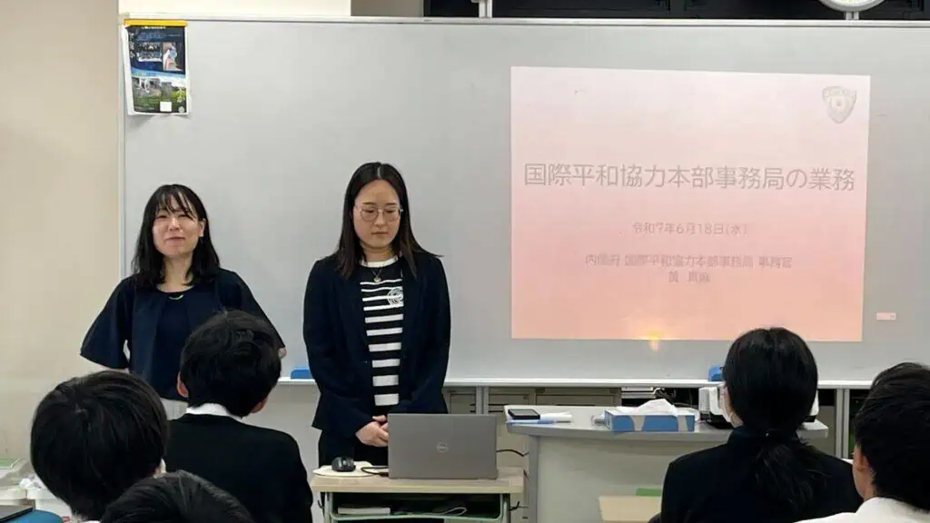 6月18日、内閣府国際平和協力本部事務局の先生方が出前講座に来てくださいました!日本の国際平和協力や国際情勢についてのお話や、先生方がどうして世界を視野に今のお仕事に就いているかなどを教えていただき、とても有意義な時間になりました。後半に行われたイスラム圏の文化に関するクイズにでは、生徒たちが班を作り、チーム対抗戦で問題に挑んでいました。「ラマダンとは何?」「男の人の恰好でしていけないことは?」とはなど日本とは大きく違う文化をたくさんの写真とともに学ぶことができました!黄先生、川端先生、ありがとうございました!