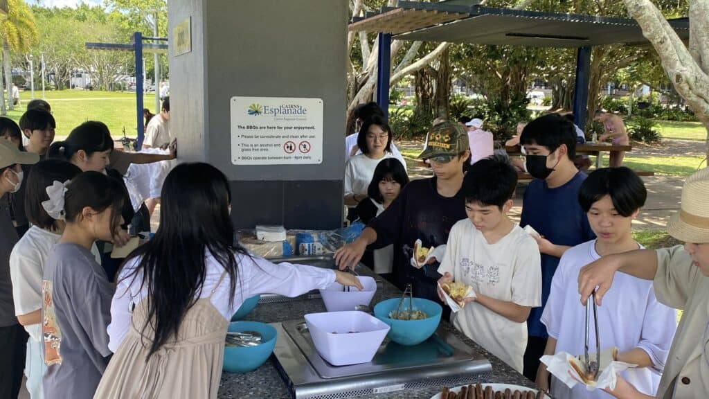 CLARKの11月・ケアンズ(オーストラリア)短期留学プログラムでは、渡航後2日目の活動として午前中に英語のプレースメントテストを実施しました。Listening・Grammar・Writingの3技能を中心に、現地での授業に向けて自分の英語力を確認しました。午後は「Cairns Esplanade Lagoon(ケアンズ・エスプラネード・ラグーン)」に出かけ、海やプールを眺めながらのBBQランチを楽しみました。お土産屋さんにも立ち寄り、生徒たちは現地の雰囲気を味わいながら交流を深める時間となりました。この日の活動を通して、生徒たちはコンピテンシー「コミュニケーション力」を育んでいます。自分と異なるコースやキャンパスの仲間とも積極的に関わり、会話を交わしながら新しい関係を築く練習をする姿が印象的でした。