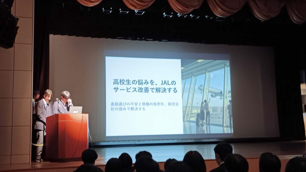 たくさんの選択授業の中でそれぞれ探究にも力をいれている総合進学コース。何人も、何グループも発表してほしいメンバーがいるのですが、今回は代表で4チームが発表を行いました!3年生の先輩が全体の進行や前振りを考えてくれ、代表の生徒たちが発表をしていきました。株式会社オカムラのミッションに臨み、『余白』というワードに向き合いながら人が自然と輪になり集える家具を考えたり、大好きなお城を実際訪問しながら海外と日本のお城を比較考察し熱をこめて語ってくれた1年生、JALと高校生をつなぐ双方にメリットのあるアイデアを展開した2年生、冷たい飲み物を買ったときの結露に焦点をあて価格帯を抑えることまで視野を広げスリーブと吸水パッドのアイデアを発表してくれた3年生。それぞれ緊張の中、ステキなプレゼンテーションを堂々とやりきりました!