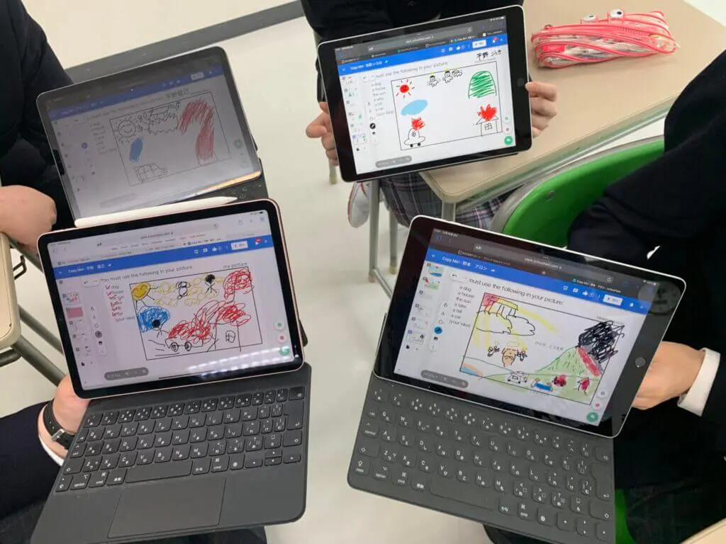 さて、先日1年生の「英語コミュニケーション」の上位クラスを覗いてみると…ネイティブの先生によるオールイングリッシュの授業が展開されていました!各自が書いた絵を英語で表現して相手に伝える練習のようですが…数々の芸術作品が生まれました!iPadとスクールタクト(ICT学習支援アプリ)を用いた学習によって生徒と先生そして生徒同士でのやりとりが生まれ、双方向の学びをより充実したものにしています。