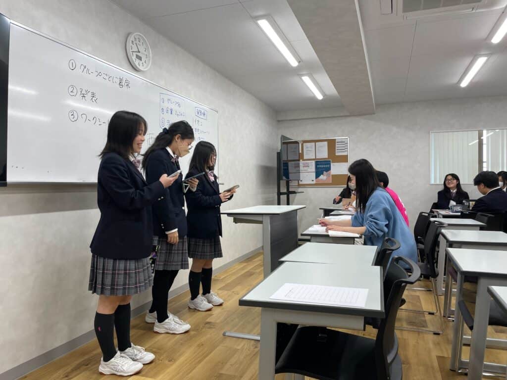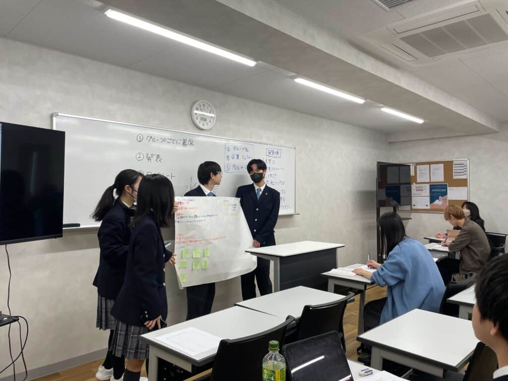 1年生は5月からキャリア探究Ⅰという授業の中で教育と探究社の「コーポレートアクセス」に取り組んできました。今回は桜美林大学入学部に所属しているディスカバ!から特別講師の方に来ていただきました。企業からいただいた課題に対してグループごとに提案を考え、プチ発表会を行い、特別講師に講評をいただきました。