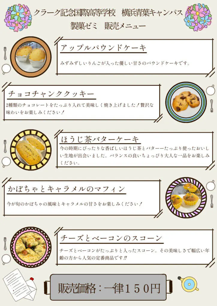 製菓販売のお知らせ 10月22日(土)横浜青葉キャンパス前 2022 10/21 お知らせ 2022年10月21日 こんにちは、明日の製菓販売のお知らせです。 明日は以下のお菓子を販売します。 秋の味覚を詰め込んだラインナップになってます! 来校待ちしています。 \ 横浜青葉キャンパスの最新情報 / 横浜青葉キャンパスへ戻る お知らせ URLをコピーしました! 関連記事 【オンラインオープンキャンパス】1月16日(金)に開催します! 2025年12月13日 【学校説明会】2025年度学校説明会開催!~12月20日(土)1月10日(土)1月31(土)~(中学3年生対象) 2025年12月13日 【授業】1年生のキャリア探究Ⅰにてディスカバから特別講師の方に来ていただきました! 2025年12月2日 【学習】ライブラリエ(オンライン図書館)で12月の新刊を読むことができます! 2025年12月1日 【資格・検定】第2回文章入力スピード認定試験を実施しました! 2025年11月28日 【ゼミ】スポーツゼミの活動~実践を通して~ 2025年11月20日 【学習】今年度第2回の数学検定を実施しました 2025年11月18日 【留学】11月ケアンズ短期留学に出発しました! 2025年11月14日