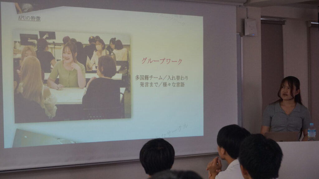 この度、昨年度卒業し、立命館アジア太平洋大学(APU)に進学した卒業生の北彩乃さんが来校し、大学生活の紹介と進学アドバイスを行ってくれました ✨