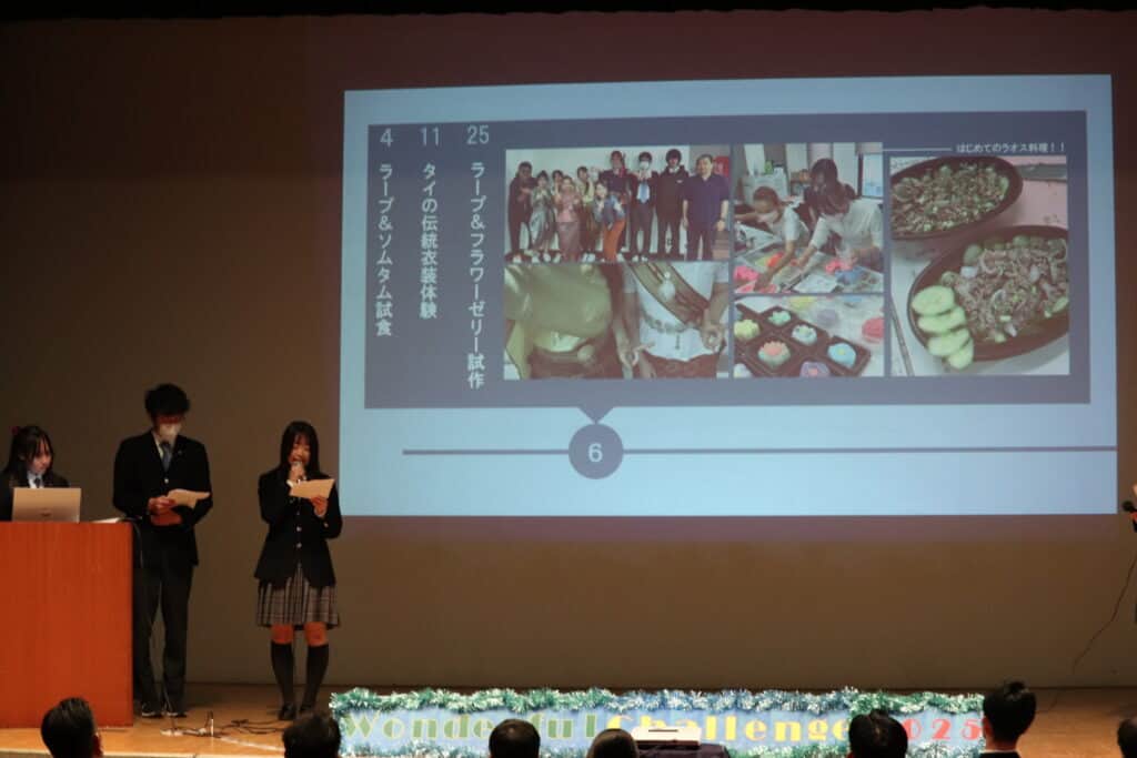 ラオスとの国際交流プロジェクト:zoomを活用した現地の高校生との交流、タイの民族衣装の着付け体験、ラオス料理の調理実習、ラオス民芸品の販売活動などを通じて、ラオスの文化や課題を体感的に学んだことの発表がありました!