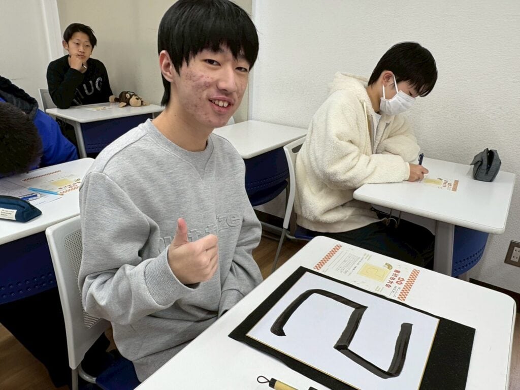 教室は墨の香りに包まれ、心地よい緊張感が漂いました。 生徒たちは一発勝負で一画一画を丁寧に、力強く書き進めていました!
