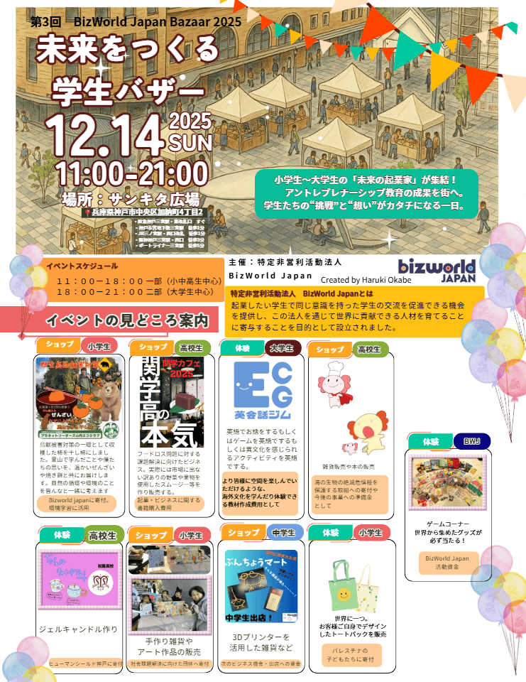 12月14日(日)、神戸・三宮のサンキタ広場で「BizWorld Bazaar」が開催されました。阪急三宮駅前という賑やかなロケーションに、小学生から大学生まで幅広い世代が出店。BizWorldプログラムを通じて学んだ学生たちが、自ら企画・運営するブースを展開し、リアルなビジネス体験に挑戦しました。