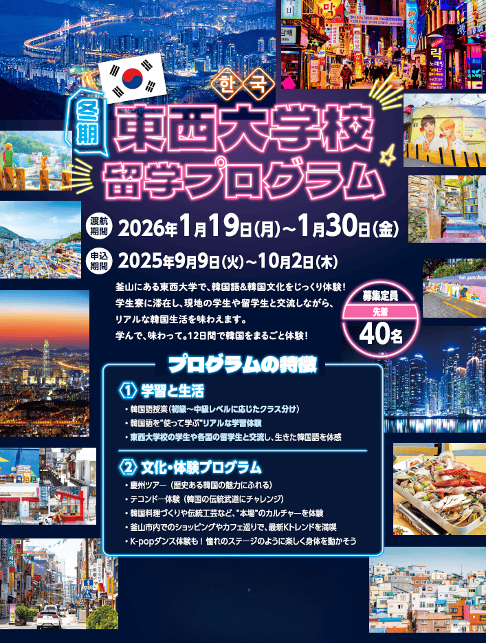 東西大学留学プログラムは、韓国・釜山にある東西大学を舞台に、韓国語学習と文化体験を組み合わせて学ぶことを目的としたプログラムです。参加者は、レベル別に分かれた韓国語の授業に取り組みながら、「使って学ぶ」実践的な語学力の習得を目指しています!