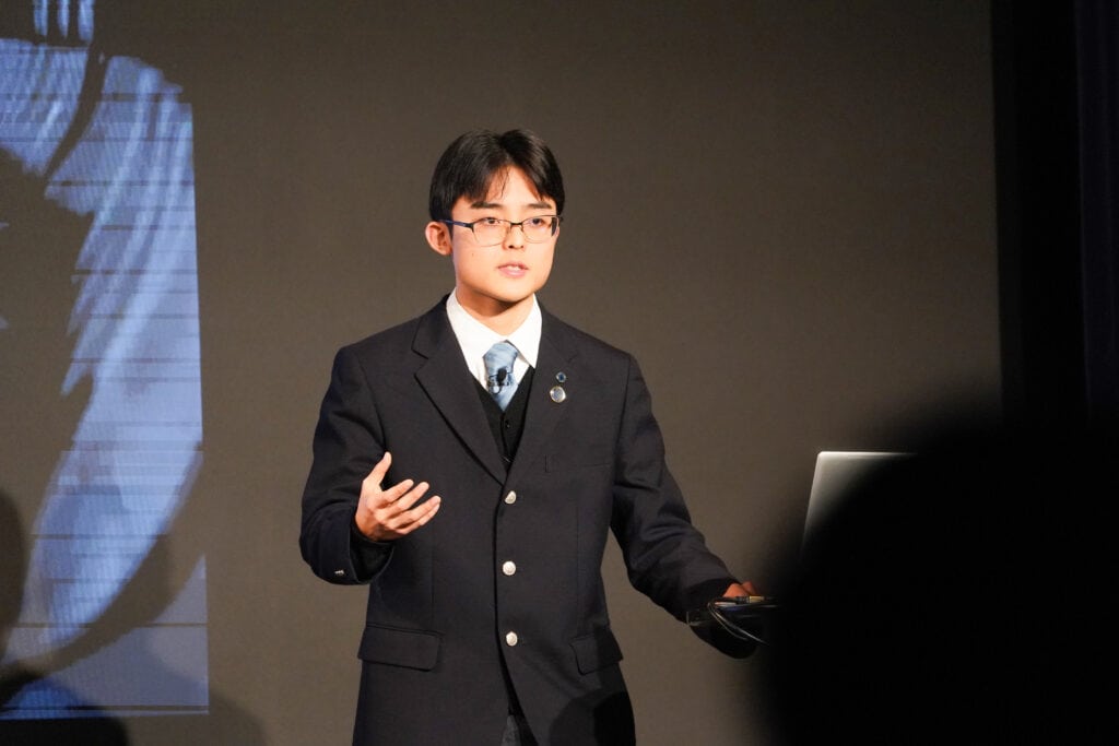本番前は緊張した表情を見せていましたが、京都キャンパスの仲間たちから届いた温かな応援メッセージが力に。いざステージに立つと、その不安を吹き飛ばすような堂々とした姿勢で、探究にかける熱い思いをしっかりと伝えてくれました。