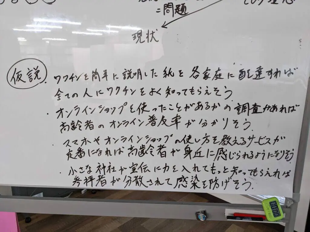 「物・サービスの発案に対する問題点の発見」→「仮説を立てる」→「情報収集②」という流れでステップアップしています。今度の「情報収集」はアンケート調査、統計などを採って具体的に実態を探るものです。開始当初に比べ生徒も積極的に発言し、内容が難しくなってきてはいるもののやりがいを感じている様子です。今は「コロナ8波」をテーマに話し合っています。