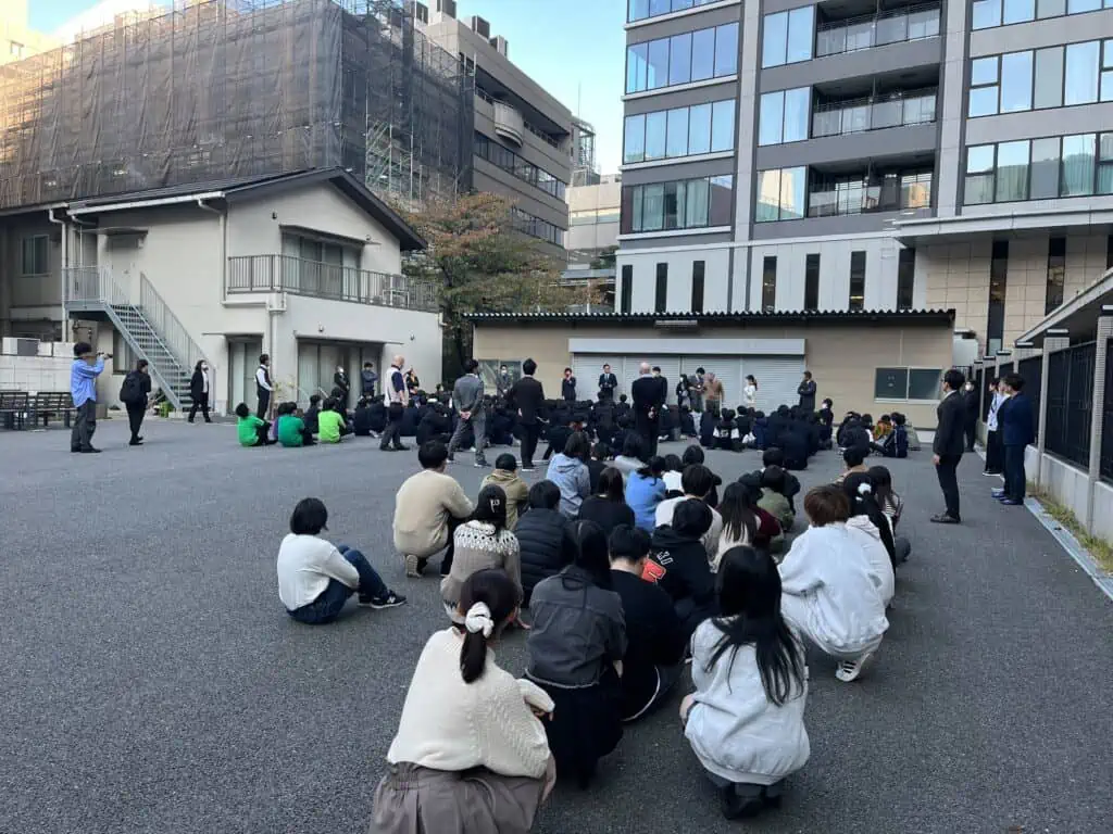 今回の避難訓練は専修学校クラーク高等学院大阪梅田校(全日制)の生徒たちと合同で実施し、震度7の地震を想定し、速やかな避難を実施することができました。
