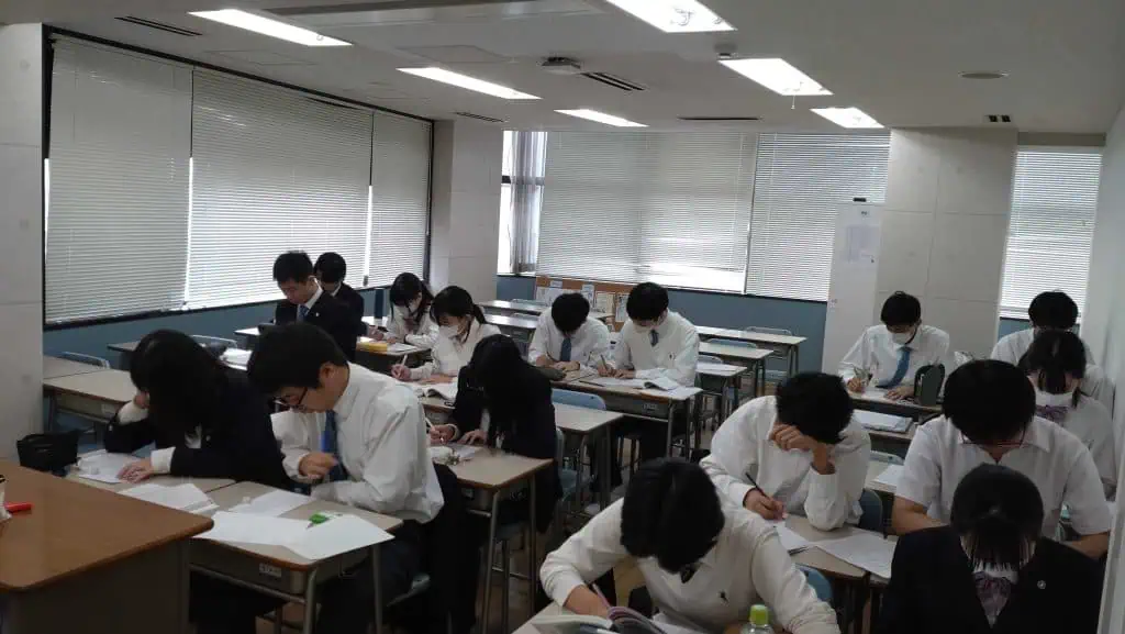 写真は、授業の最後に「抗争を避けるためにはどうしたらいいか」をテーマに、意見文をそれぞれ書いてもらっているときの様子です。みんな熱心に自分の考えを書いています。