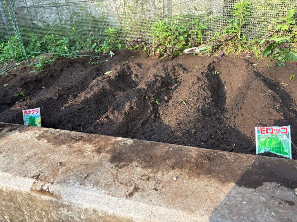 予め土や肥料を加えて混ぜ込んだ土を畝の形に整えた後、丁寧にタネを撒いていきます。