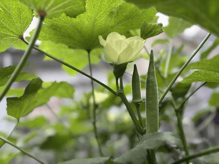 自転車置き場横の畑スペースでは、オクラとモロッコインゲンを育てていました。