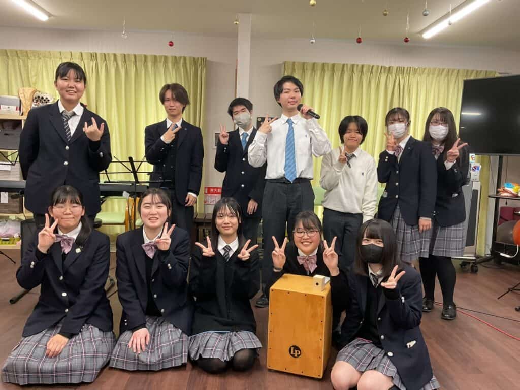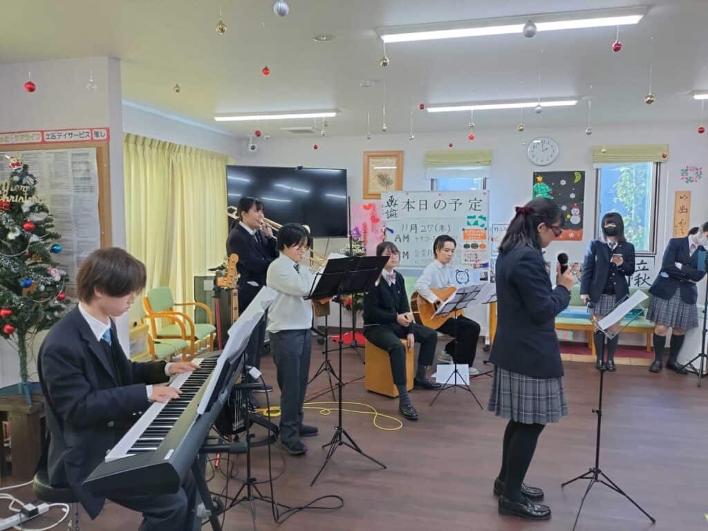 今回は地元のデイサービスに自ら連絡を取り高齢者に向けた演奏会を企画しました。曲選びから段取りを含めて生徒たちが自主的に行いました。高齢者の方々が喜びそうな「上を向いて歩こう」「糸」などを演奏してきました。