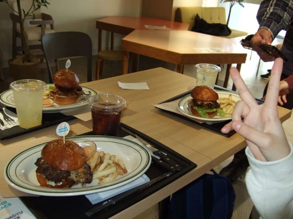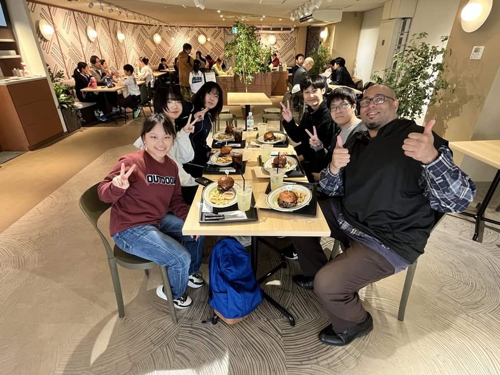 ペイント作業が終わったあとには、アメリカ人の先生と一緒に「アメリカン和牛ハンバーガー」を楽しみました! とってもおいしかったです!