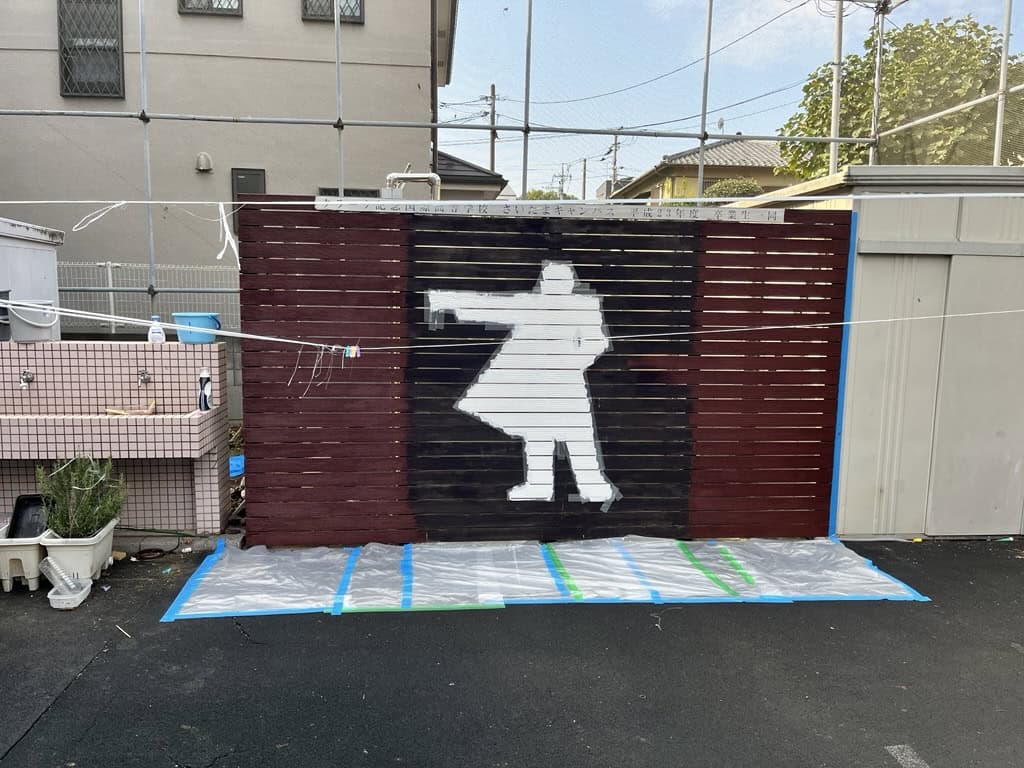 This project will take 2 days to finish, but we are working hard. We have to prepare the surface, mask the design, and then paint. We will complete the whole wall this month. We hope that all Clark Saitama students will feel proud every morning when they see our school logo on the wall.