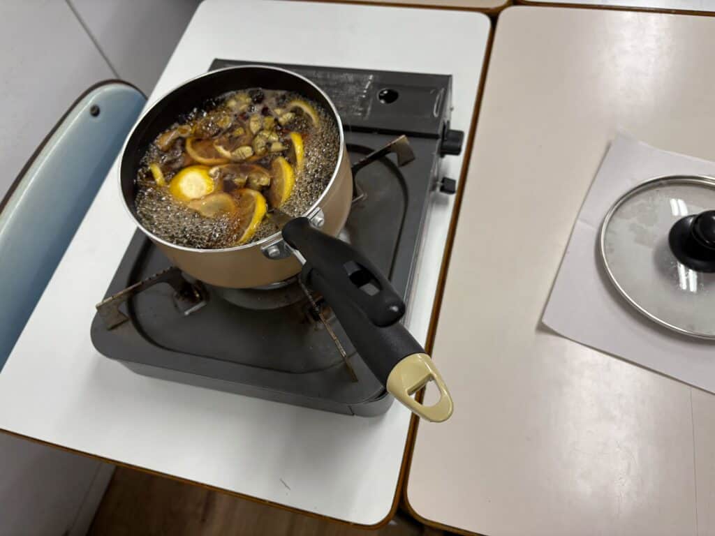 この日は、年内最後の授業となっていたため、これまでの活動報告と今後の活動についての報告と、スパイスを使ったクラフトコーラ作りを行いました。数種類のスパイスと、レモンと生姜、黒糖を水と一緒に煮込みます。30分程煮込むとコーラシロップの完成です。このシロップは一日漬け込んでおくことでより素材の味を引き出すことができます。