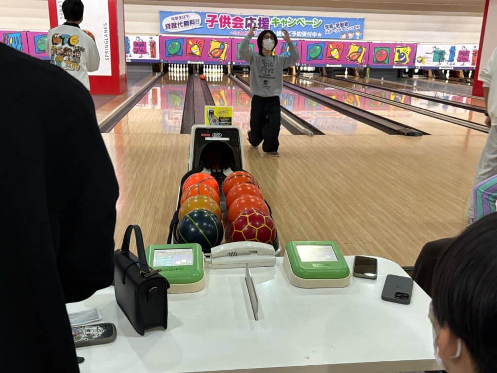 そこから各レーンに分かれてボウリング大会を行いました。ストライクやスペアが出て盛り上がったり、初めてボウリングをした生徒も回を追うごとに上達が見られたりと、それぞれ楽しそうな様子でした。先生も参加し、生徒たちと一緒に楽しみました。