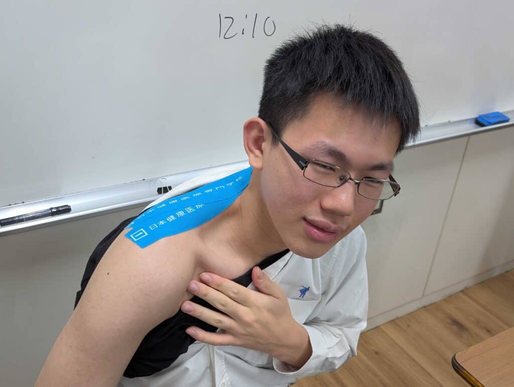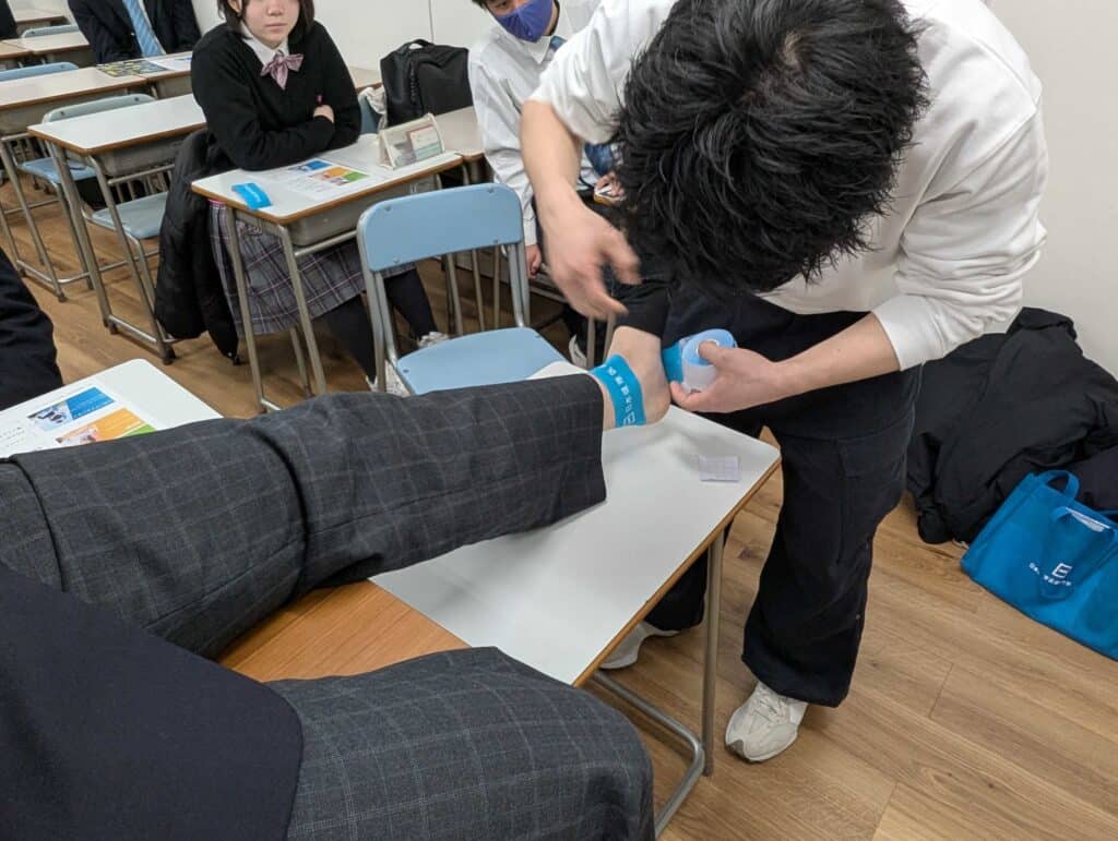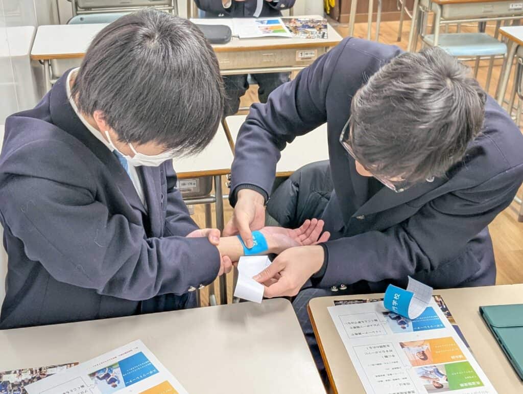 今回、その柔道整復師のお仕事や将来の展望について、お話をいただきつつ、実際にどのような勉強やキャリアプランにつながるかの理解を深め、進路選択の幅を広げる授業を行いました。生徒たちは、テーピング体験や、先生が鍼を打つ様子を見学しました。日頃、手首の痛みなどがある生徒は、代表で専門的なテーピングを体験。その結果、手首の動きが楽になり、痛みが軽減されたと話していました。