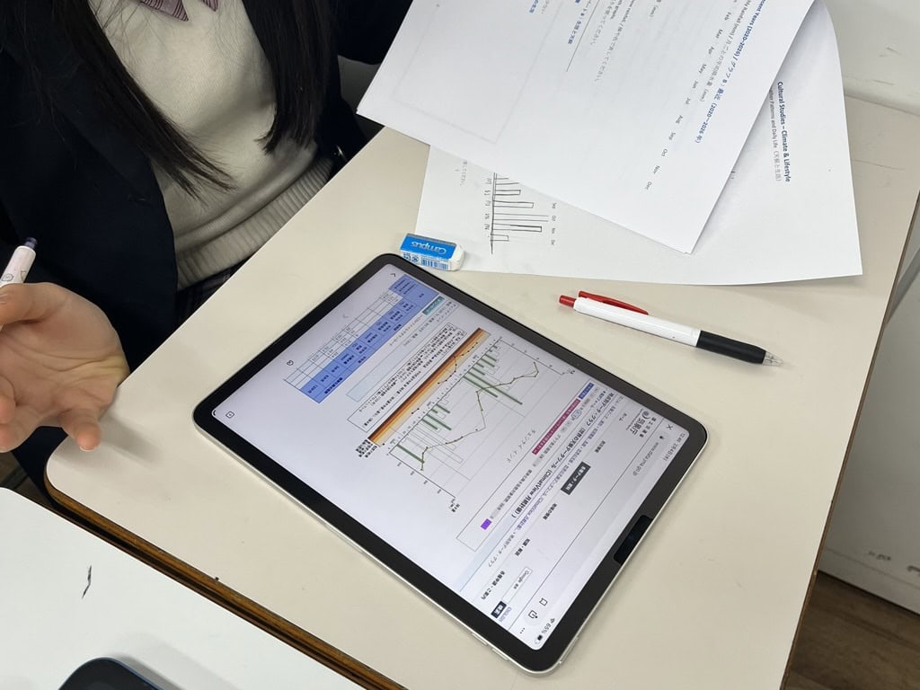 写真では、International Course の生徒たちが実際のデータを使って棒グラフを作成している様子を見ることができます。IELTS、TOEFL、TOEIC などのアカデミックな試験では、グラフや表を読み取り、理解し、説明する力が求められます。そのような課題に取り組む前に、まずは自分たちで表やグラフを作成できることが重要です。