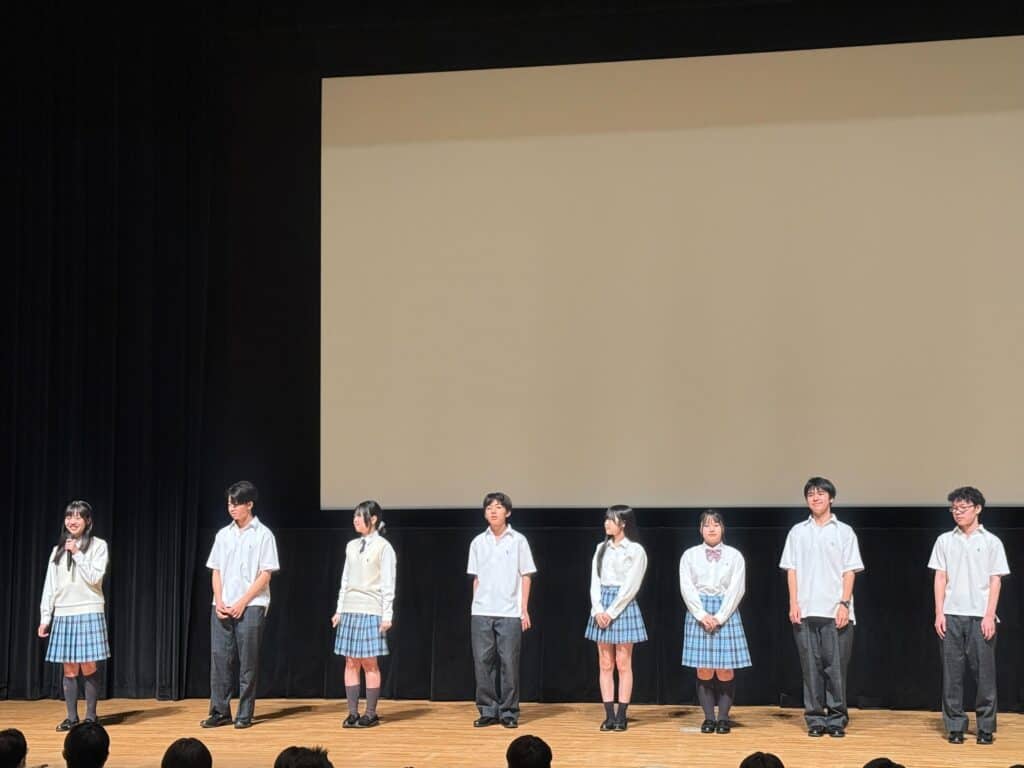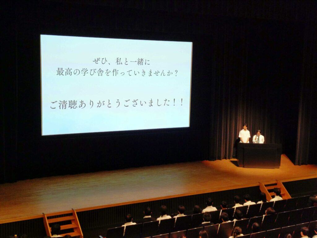 後半は生徒会選挙を行いました。2学年4名、1学年4名、計8名が生徒会役員の座を懸けて演説を繰り広げました。候補者演説だけでなく応援演説も行い、各候補の魅力をアピールしていました。