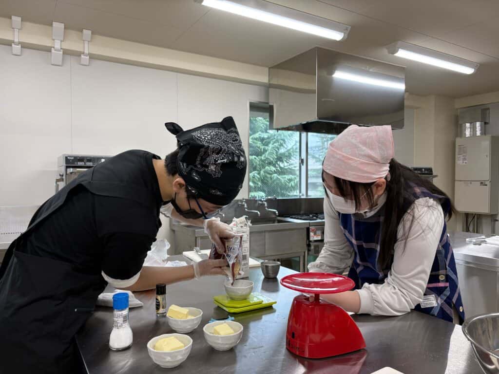 スイートポテト作りでは、さつまいもをなめらかにマッシュする工程に少し苦戦する場面もありましたが、先輩・後輩を問わず日常会話を楽しみながら、笑顔の絶えない雰囲気で調理が進みました。さらに、余った材料を活用してメレンゲクッキーまで作る工夫も見られました。