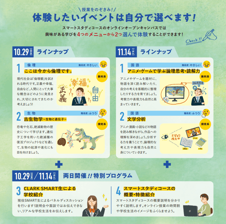 ※クラーク高校のスマートスタディコース、オンラインオープンキャンパスでは興味がある学びを2つ選んで体験することができます