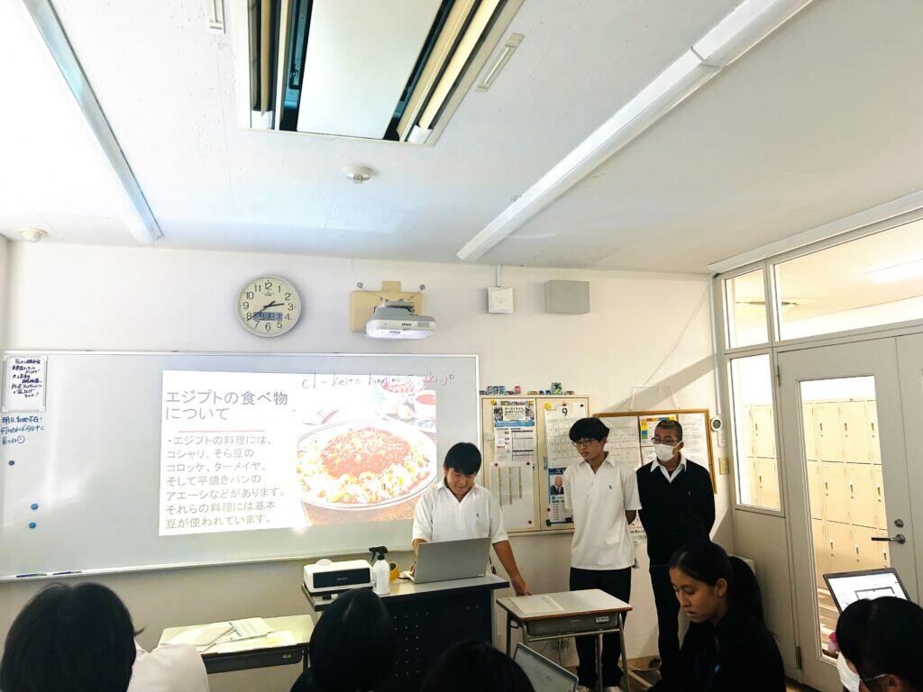それぞれのグループが、その国を選んだ理由、行程や、調べた観光地、飲食物をユニークな内容で、工夫を凝らしたパワーポイント、発表の仕方で説明することが出来ました。かなり大人数な探求なので、緊張している人、堂々と話せている人が居ましたが、こういった場面を経験として、人前で話す能力を培って欲しいと思っています。また、国際的な視点を持つ人材になって欲しいと願っています!