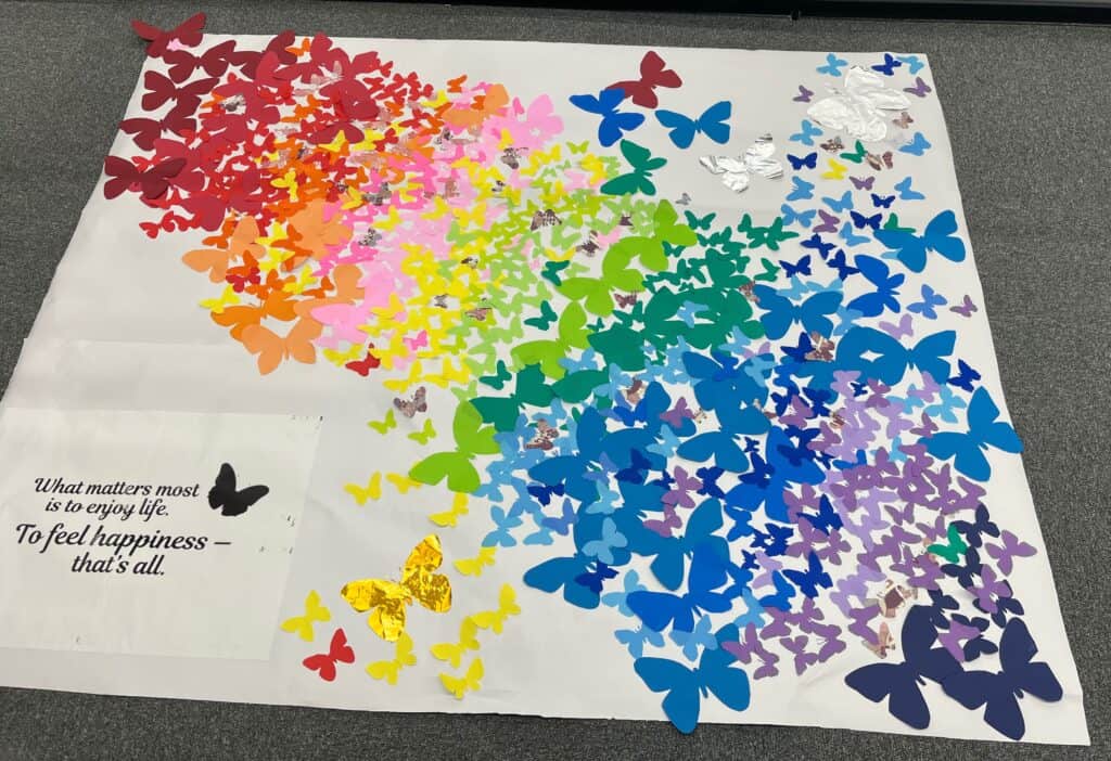 3年生は2号館に飾る壁面装飾を担当し、「蝶」をテーマにした作品を制作しました。羽ばたく蝶には、これからの未来へ向かう希望や旅立ちの意味が込められています。そして、作品の中央には3年生が選んだメッセージが添えられ、今後自分達がいたという証を作ることができました。
