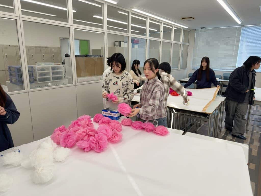 1・2年生はお花紙を使ってフラワーウォールを制作しました。色とりどりのお花紙を丁寧に折って貼り合わせ、春らしい華やかな壁面が完成しました。協力しながら一つひとつの花を作る姿がとても印象的でした。