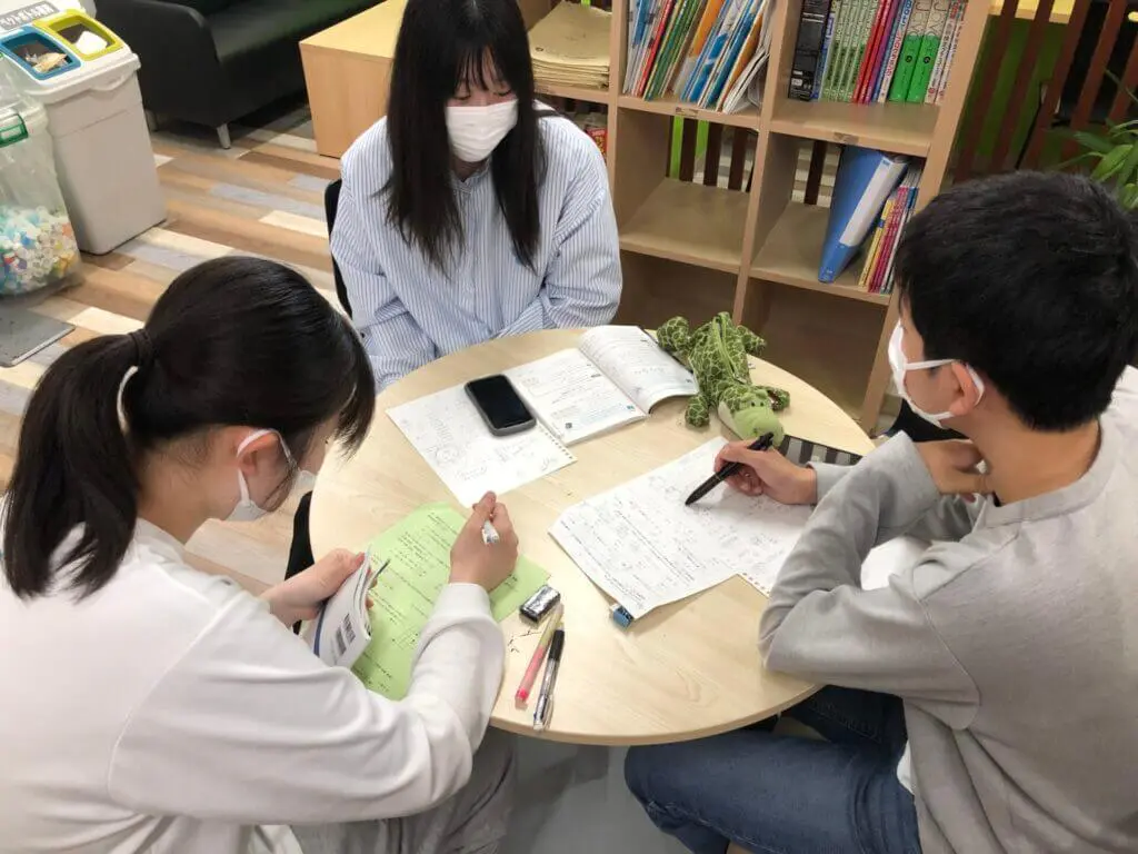 写真のように自習室で課題について教えあって取り組むことをしています。