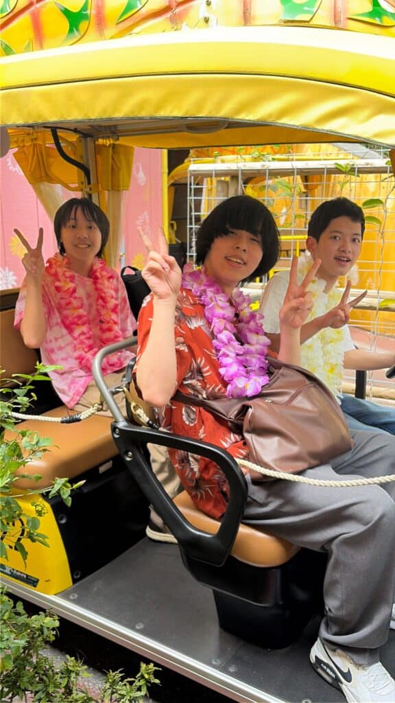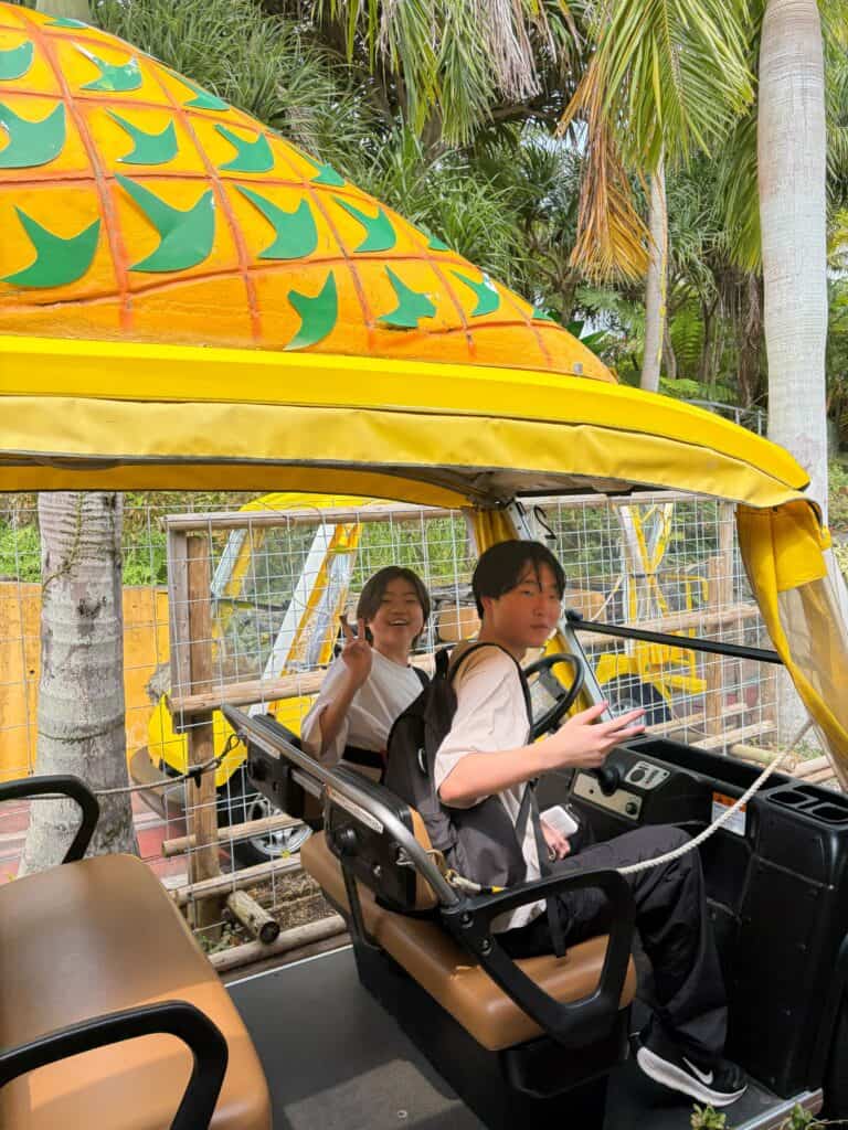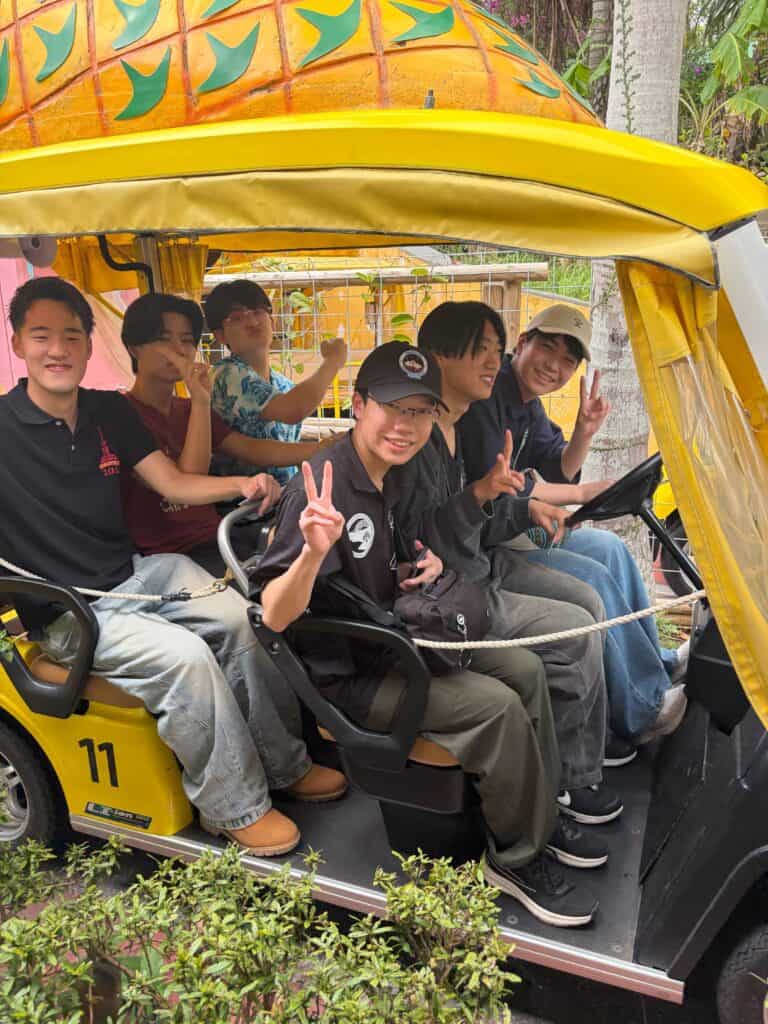午後はナゴパイナップルパークを訪れ、パイナップル号に乗車。南国ならではの雰囲気の中、甘く美味しいパイナップルを味わいながら、楽しいひとときを過ごしました。