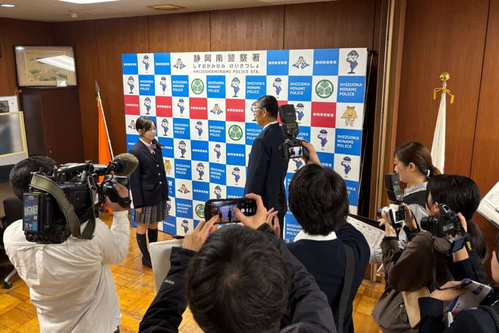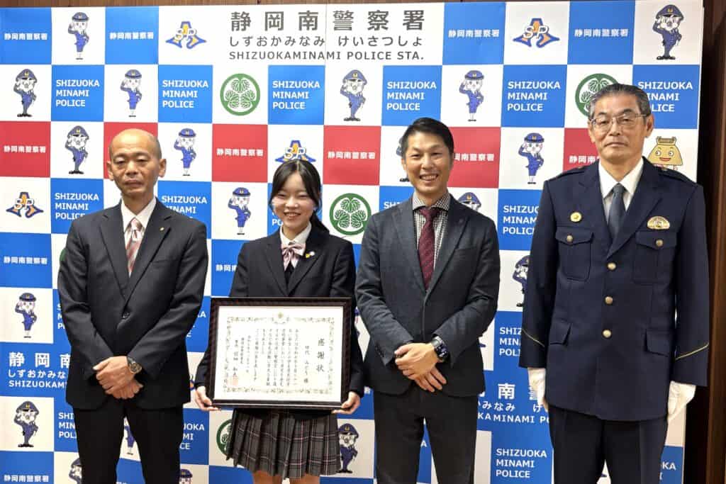本校2年生の田代さんが、小学生の行方不明事案において、児童の発見および安全な保護に協力したことが評価され、静岡南警察署より感謝状が贈呈されました。