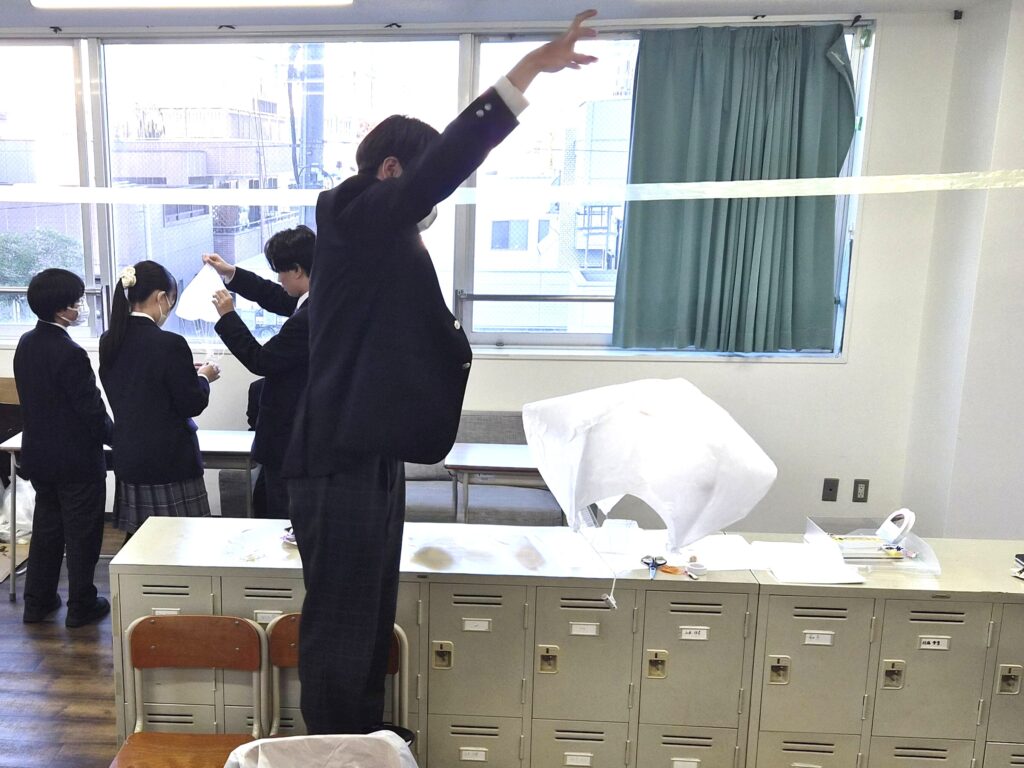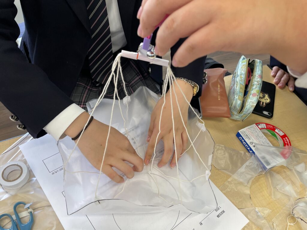 静岡キャンパスでは、宇宙空間から帰還時に使用されるパラシュートを模擬的に実施しました。