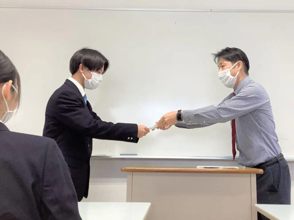 本日の帰りのホームルームは1年生合同で行い、学年主任の靭矢先生より一ヶ月皆勤の表彰がありました。11月も皆勤対象者はもちろん、みなさん各々の目標に向かって頑張ってきましたね。