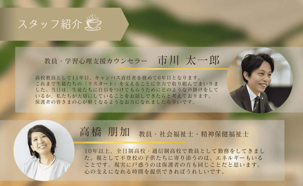 「お子さまの進路選び、保護者としてできる取り組みを知りたい」「今かかえているご家庭の悩みや想いを、専門家に話してみたい」「他の家庭ではどのようにしているのか、情報交換してみたい」等