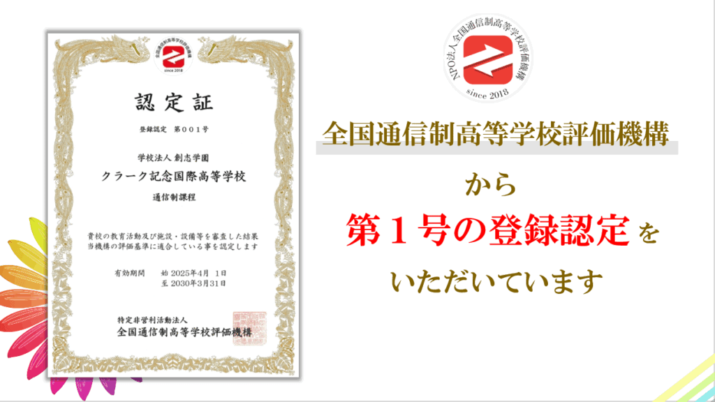 2025年4月、クラーク記念国際高等学校は、全国通信制高等学校評価機構より第三者評価において評価基準に適合しているとして、認定が更新されました。本校はこの制度が始まった当初から評価を受けており、全国で第一号の認定校です。