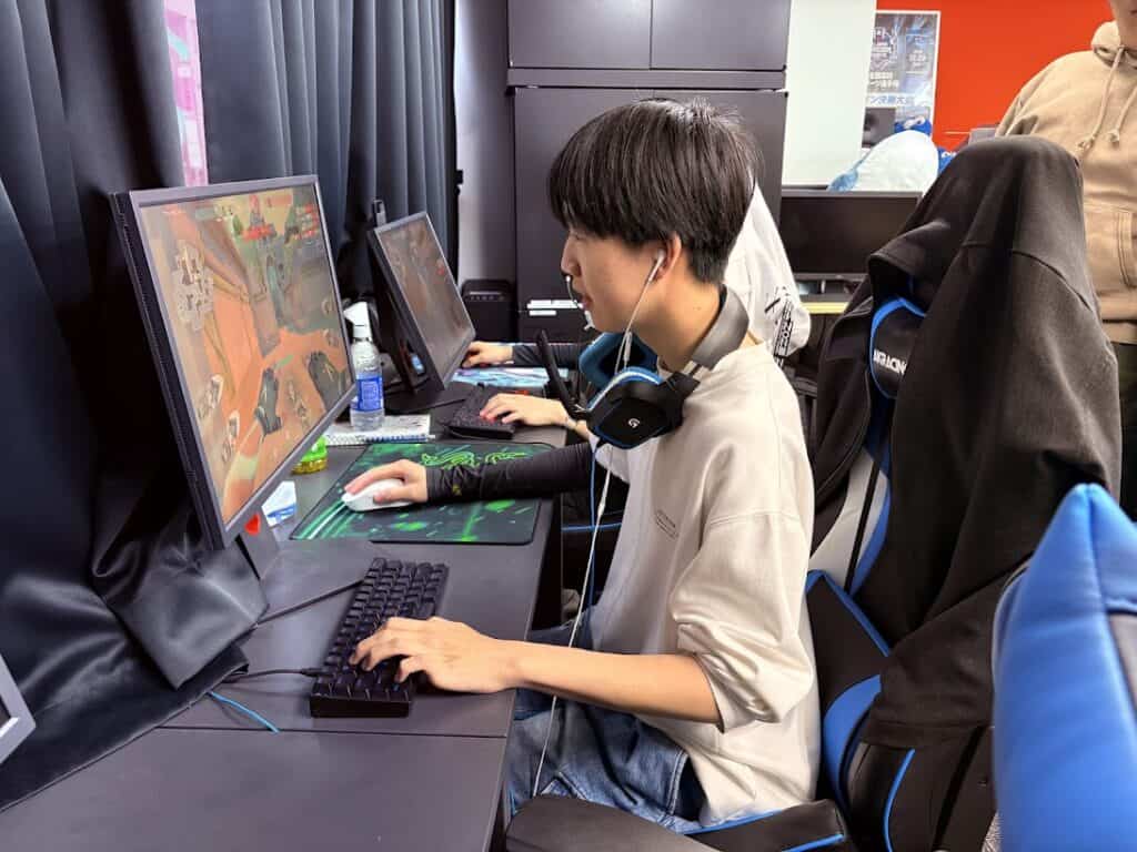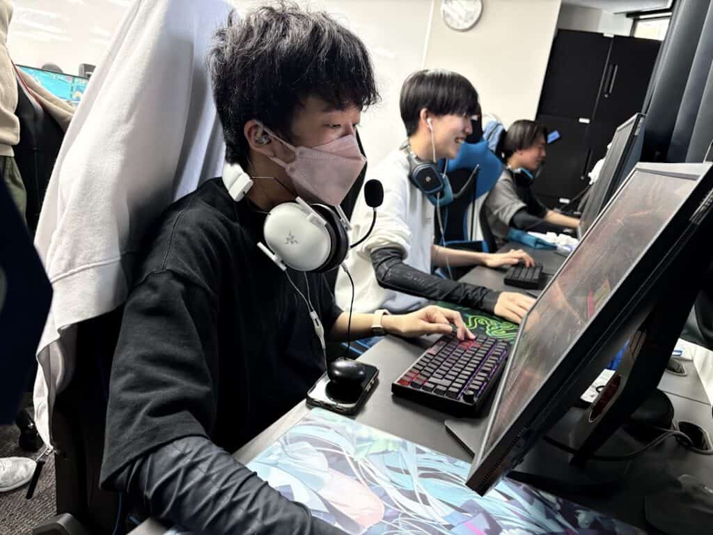 専用実習室には、ハイスペックなゲーミングPCが30台以上並び、室温が数度上がるほどの熱気に包まれています。年2回開催される大規模な高校生大会を見据え、ヘッドセットを装着した生徒たちは、刻一刻と変化する戦況を鋭い眼差しで見つめています。