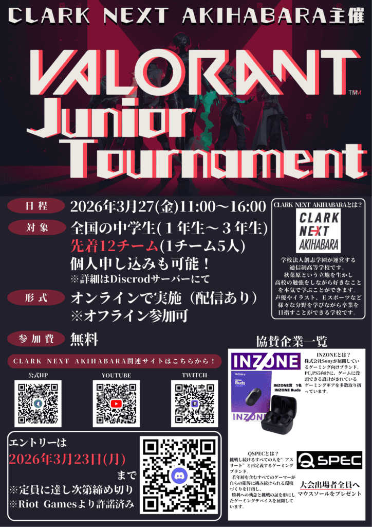 CLARK NEXT Akihabara主催 eスポーツ大会「VJT(VALORANT JUNIOR TOURNAMENT)」を開催します。