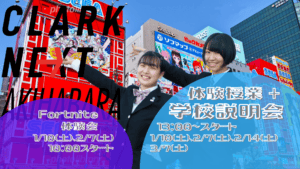 CLARK NEXT Akihabaraは、「好きは最強」「好きから未来を広げよう」をモットーに教育を行っています。 通常の学校教育にプラスして生徒たちの興味関心に合わせた専門的な教育を受けられるのはCLARK NEXTだけ! 秋葉原の街で、他の通信制高等学校にはない「学校らしさ」を重視し、尚且つ特化した教育を行っています。 今年度からは、各専門分野を横断して授業が受けられるようになる「プロジェクト型授業」もスタート! ますます進化していくCLARK NEXT Akihabaraを是非見にきてください!