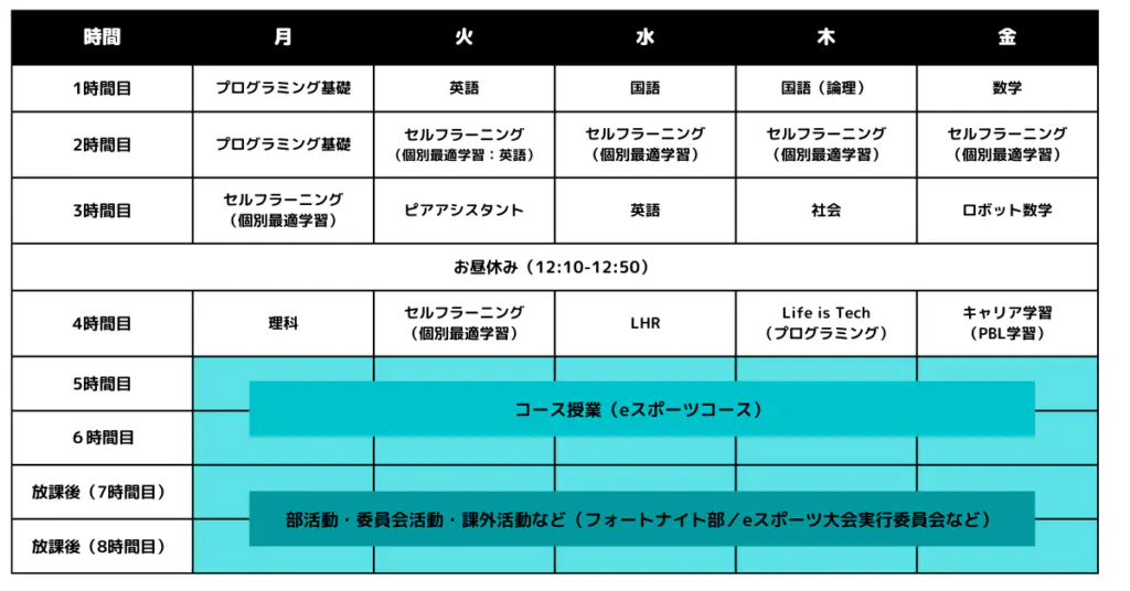 午後の5時間目・6時間目はいよいよ各自の好きを伸ばすコース授業を受講できます。月曜日から金曜日までの2コマで10時間、そして放課後2時間程度の部活動や委員会活動などを通じて、最大20時間近いeスポーツの取り組みに挑戦することができます。部活動や委員会活動は強制参加ではないので、自分のペースで取り組みに挑戦できることも魅力です。少しずつ「やってみたい」という気持ちを形にしていくことで、充実した高校生活を目指せます。
