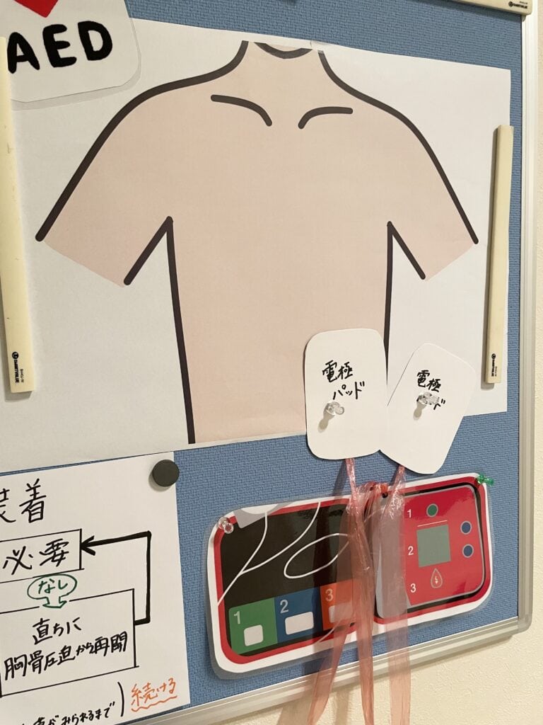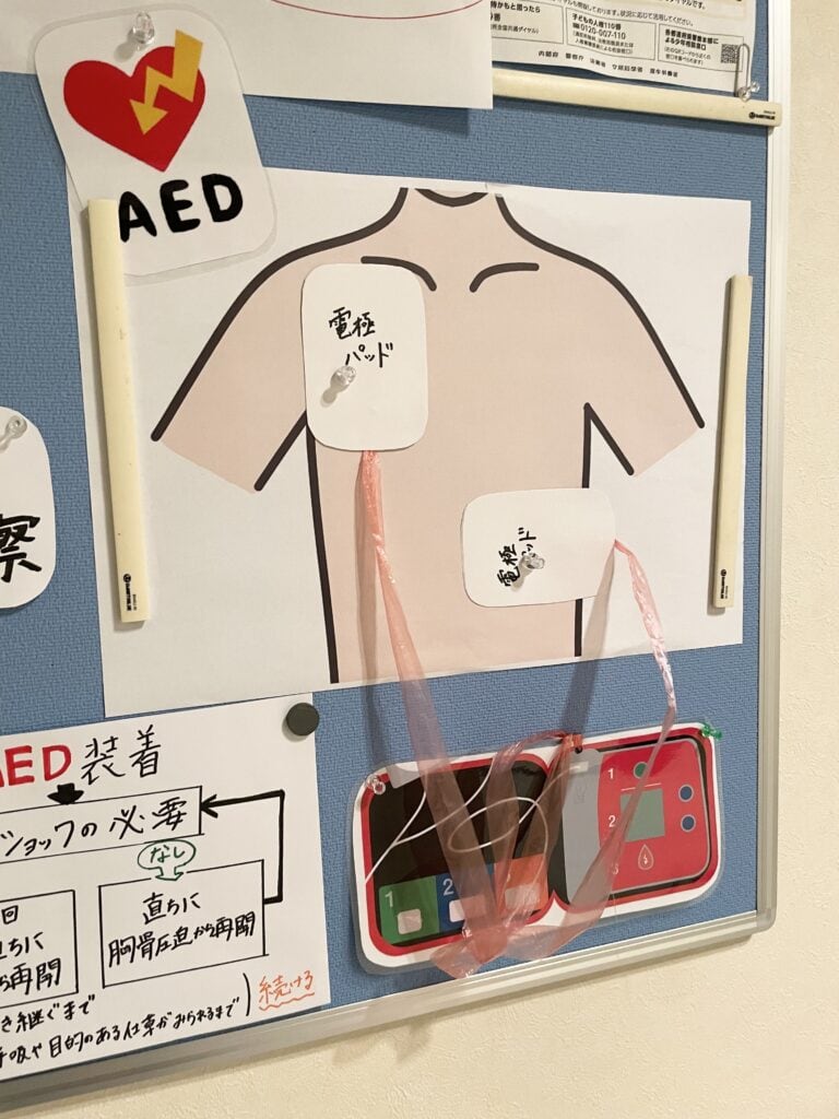 生徒がキャンパス付近で見つけてくれたAEDの写真や、AEDの電極パッドを模したものも掲示してみました!