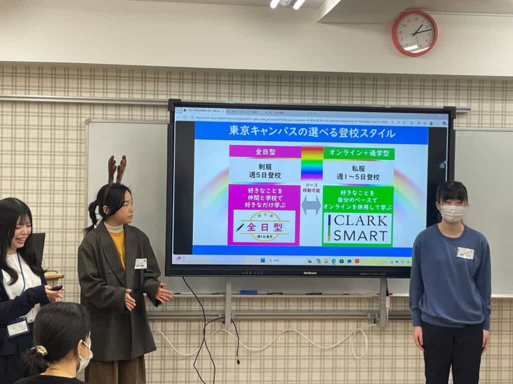 「クラークスマート東京にまつわるクイズ」を広報委員や実行委員生徒が企画し、受験生の皆さんと一緒に盛り上がりました。最初は緊張していた受験生の皆さんの表情が、クイズを通してパッと明るくなったのが印象的でした。