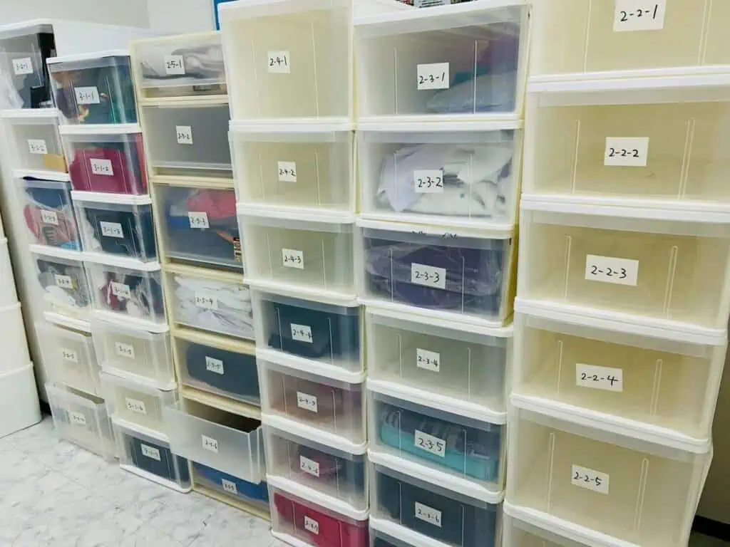 この春休み期間には、過去の公演で使用してきた衣装や小道具の整理を行い、倉庫の大掃除を実施しました。着物や特殊衣装など、その数はなんと100ケース以上。