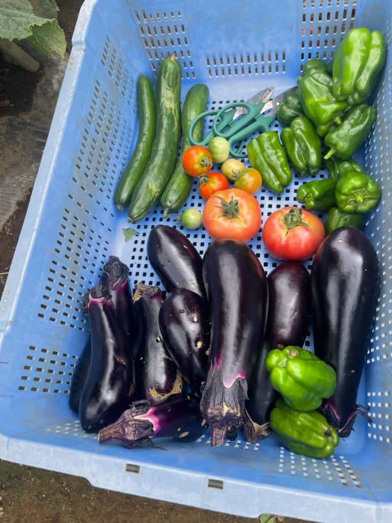 ナス、きゅうり、ししとう、トマト、ピーマン、キャベツ、とうもろこし、インゲン、大根、じゃがいもなどの様々な野菜を育て、7月頃に収穫をしました!収穫した野菜はどれもハリがあり、とても美味しそうでした!