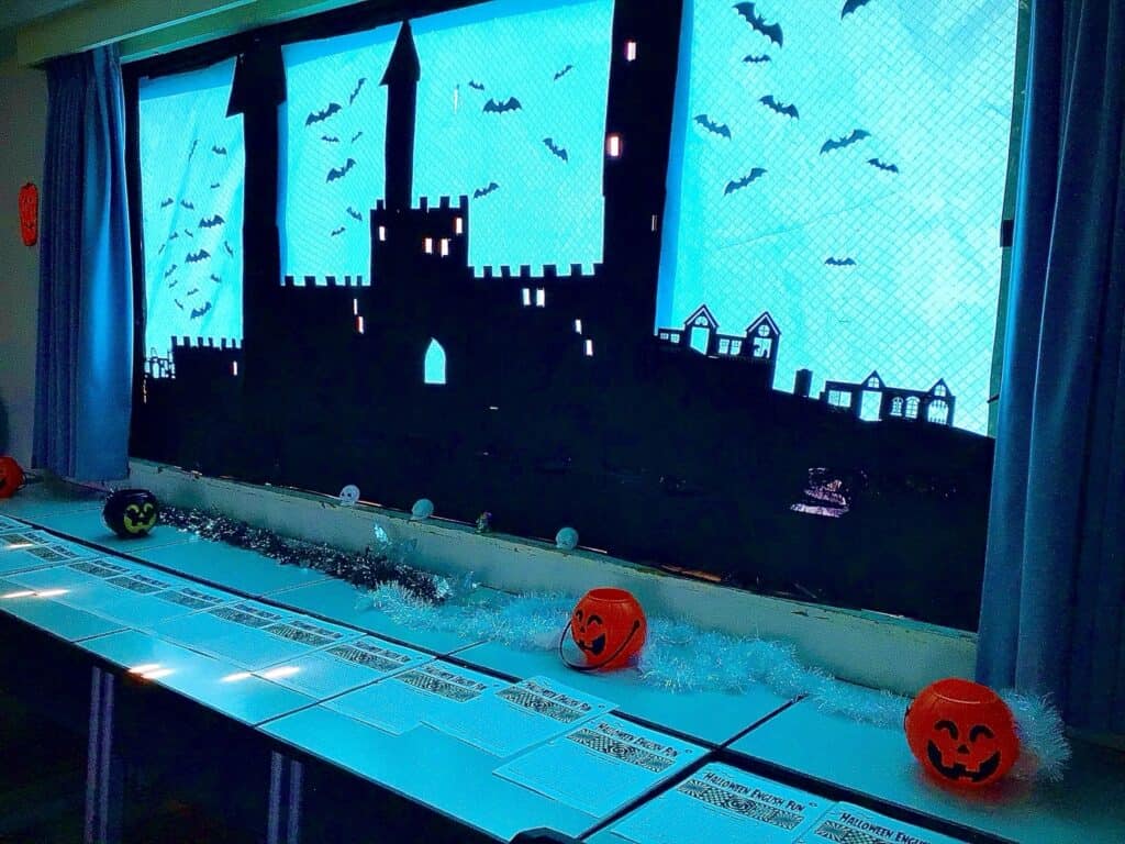 葉がからオレンジ黄色へと色づく季節がやってきました。日中は涼しくなり、日が短くなります。ハロウィンパーティーの季節です。オープンキャンパス授業では、アイルランド発祥の祝日を祝うため、教室をオリジナルの怪しいアートで飾りつけました