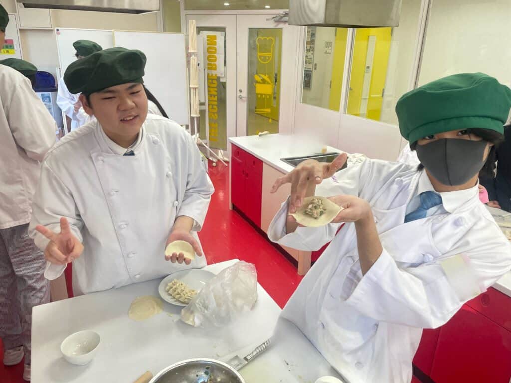 さらに、中国では餃子が家族のつながりを象徴する料理であること、地域ごとに特徴があることなど文化的背景も紹介。生徒からは「食は文化とセットで学ぶともっと面白い!」という声もあがり、料理を通して世界を広げる時間となりました。