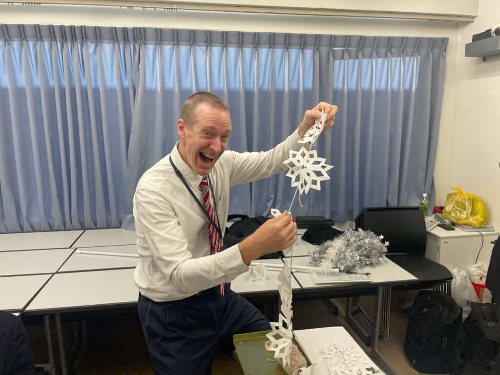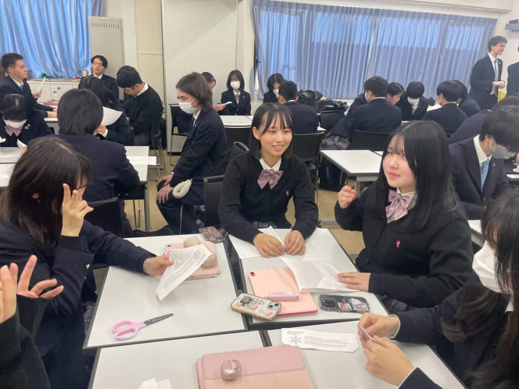 グループに分かれた後に、アイスブレイクの一環として、はさみで切るだけで出来る雪の結晶を作りました。結晶の作り方はすべて英語で書かれており、最初はどのように作ればよいか分からなかった生徒も、周りの先輩や先生方に聞いたりして、最終的に多くのグループが雪の結晶を作ることが出来ました。