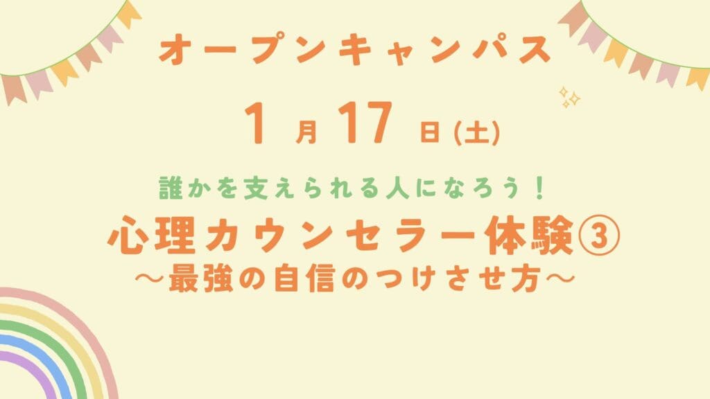 そして、2026年1月17日(土)は今年度最後のオープンキャンパスが開催されます。保育・福祉コースのオープンキャンパス体験授業では、「心理カウンセラー体験③~最強の自信のつけさせ方~」を実施します!